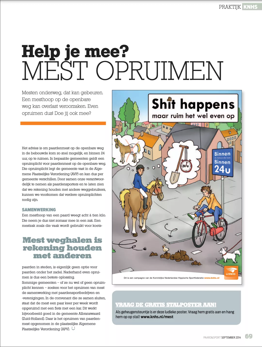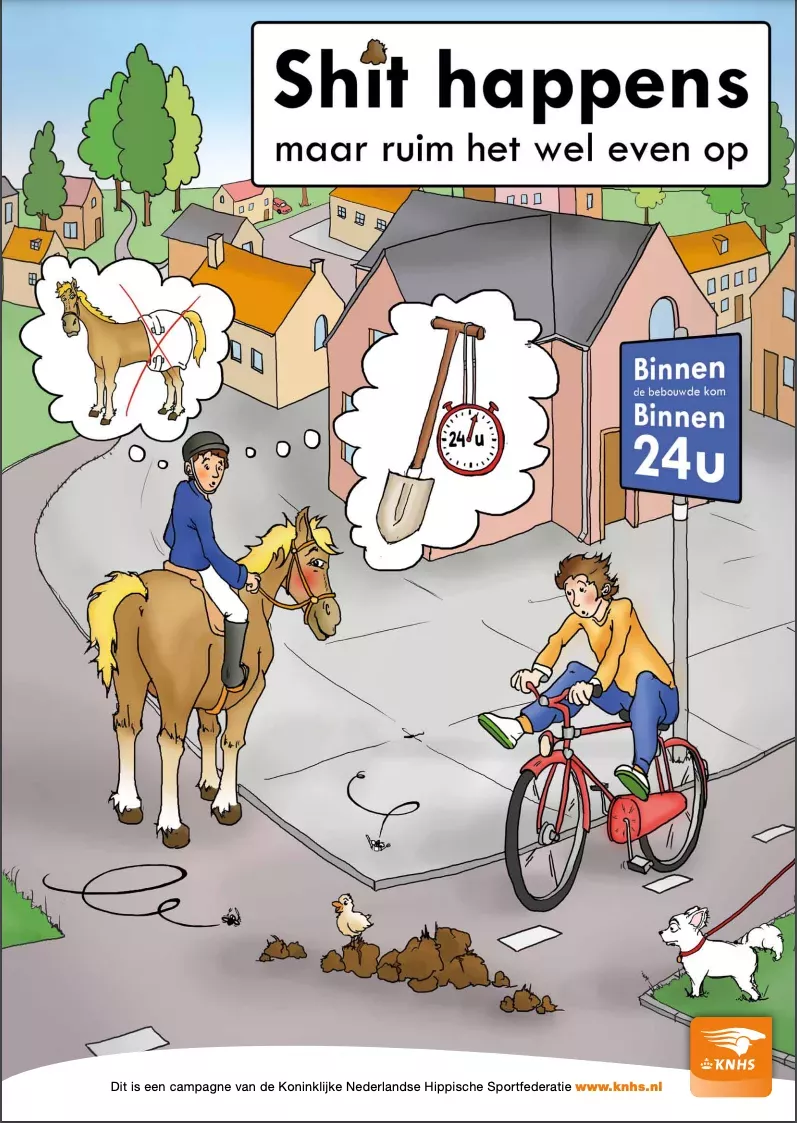 In sommige gemeenten moet je de mest al verplicht opruimen via de Algemene Plaatselijke Verordening (APV). Andere gemeenten overwegen om mestzakken verplicht te stellen, maar daar zitten nadelen aan. Weer andere gemeenten zetten speciaal voor ruiters en menners afvalemmers neer. Door de bebouwde kom schoon te houden kunnen we met z'n allen mogelijke (verdere) verplichtingen of boetes voorkomen. Dat kan simpelweg door binnen 24 uur de mest op te ruimen, gewoon met een schep en/of bezem. Als geheugensteuntje heeft de KNHS een ludieke stalposter ontwikkeld. Hieronder kan je hem direct downloaden om op te hangen op stal!